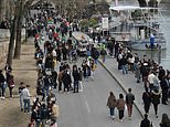 Olivier Veran told reporters this morning that further restrictions on movement might be required within the coming days. Pictured: Group of friends have drinks on the banks of the Seine river in Paris earlier today