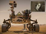 Perseverance is seen being lowered by the sky crane from the ‘jet pack’ to the surface of Mars on Thursday. The Ingenuity mini-helicopter is attached to the rover’s undercarriage