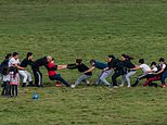 A break in the rainfall that has saturated much of Britain this week provided the perfect opportunity for crowds of people to head outside to enjoy the hottest day of 2021 so far. Pictured: These people were spotted enjoying a tug of war on Hampstead Heath as conditions continue to improve