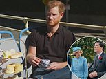 But moments later the bus braked heavily and the dinner wagon holding the tea jolted into Prince Harry – who swore in shock – before he spat his drink out while laughing.
