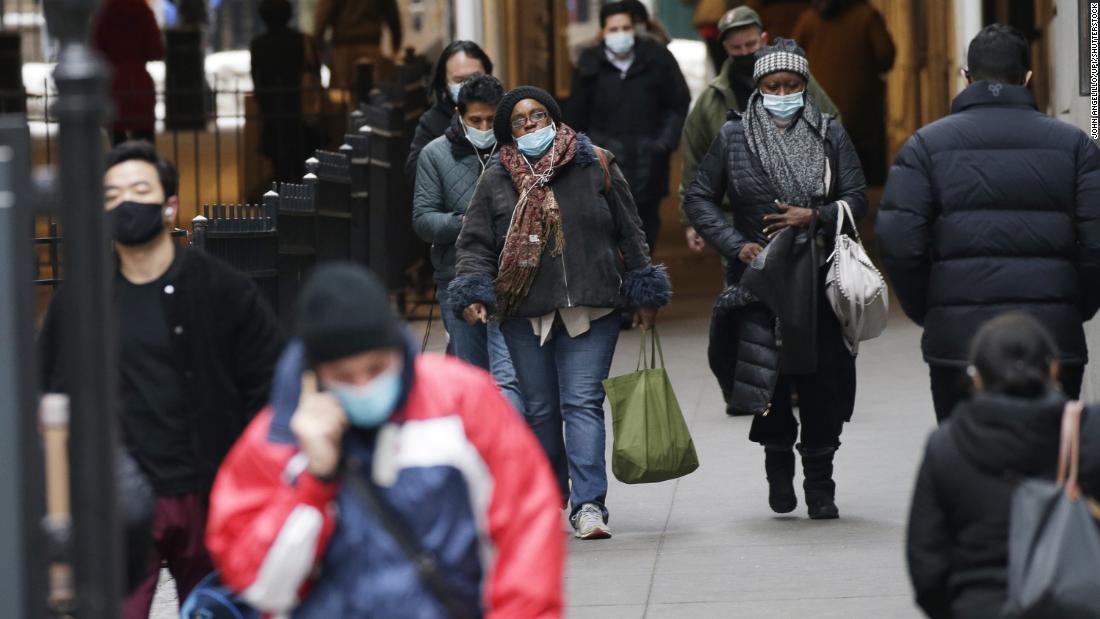 Pedestrians walk wearing face masks to help prevent the spread of coronavirus in New York City on February 22, 2021