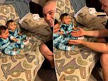 The video shows the twins examining Jonathan’s face before bursting into tears when he stretches out his arms (pictured, left and right)