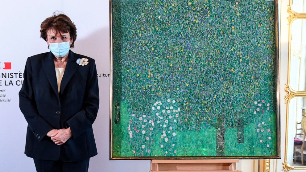 The colorful 1905 oil work by the Austrian symbolist painter titled “Rosebushes under the Trees” has been hanging in Paris’ Musee d’Orsay museum for decades.