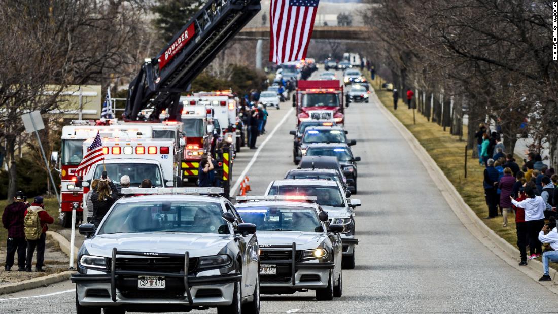 Hundreds lined the streets as a hearse transferred his body from the coroner’s office to a funeral home in Aurora. Many placed their hands over their hearts and some held American flags. Many public safety vehicles joined the procession.