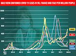 Pictured: A graph comparing the daily new confirmed Covid-19 cases in the UK, France, Germany, Italy and Spain, as Europe is gripped by a third wave of the virus