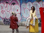 A visitor to the Lower East Side neighborhood of Manhattan poses for a photo without wearing a mask in front of a graffiti mural on Friday