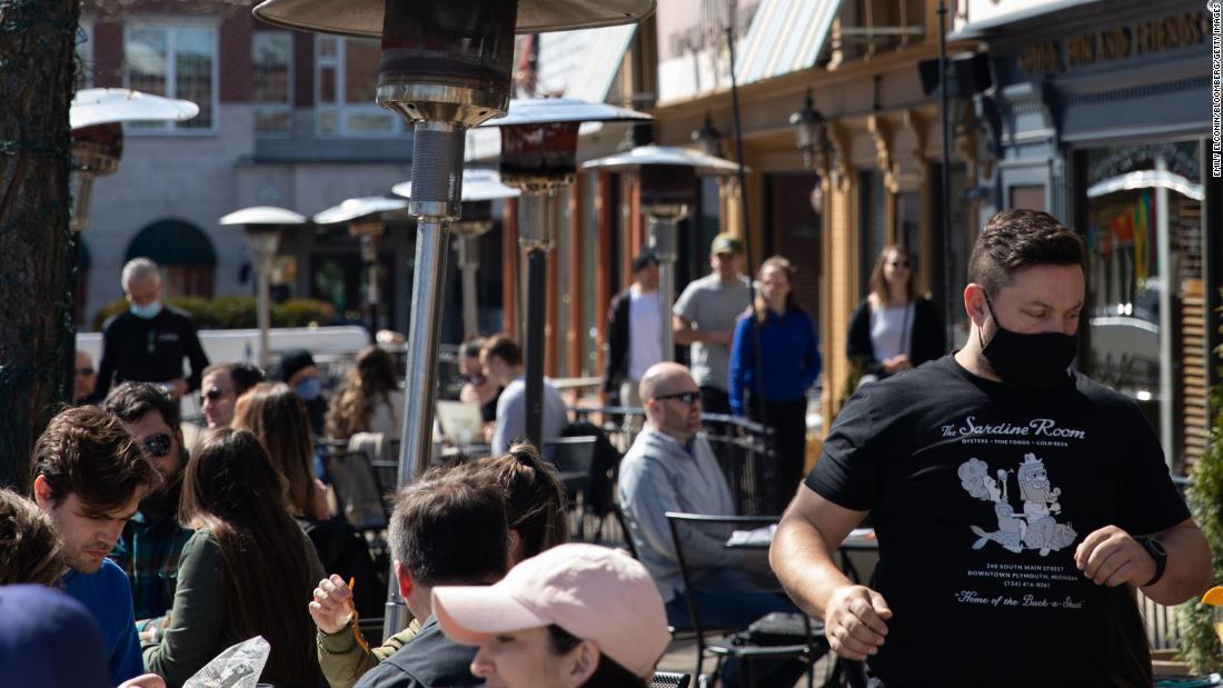 People dine outside at a restaurant in Plymouth, Michigan, on Sunday, March 21, 2021