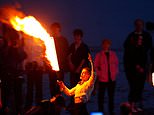 A woman was seen performing with fire in Brighton. Many Britons continued their outdoor revelling into the evening