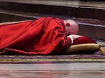 Pope Francis lies down in prayer prior to celebrate Good Friday Mass for the Passion of the Lord today