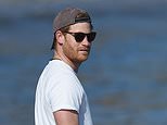 The soon to be father-of-two went barefoot for the outing in Santa Barbara, California, where he wore a white t-shirt with blue cargo shorts and carried a pair of trainers as he walked along the sand.