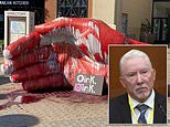 Soon afterwards, a similar looking group splattered animal blood on a statue of a hand in a nearby shopping mall, leaving a sign with a picture of a pig and the words ‘Oink Oink’.