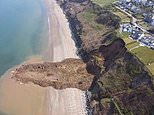 Huge landslide sends hundreds of tons of mud across a Welsh beach leaving row of luxury detached houses teetering on the edge of new cliff