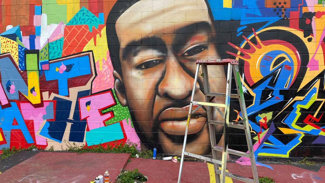 CNN affiliate KTRK reported the mural in Floyd’s hometown was defaced with a racial epithet which was then covered up and the painting restored by the artist who created it.