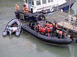 A border Force officers guides a migrant up a ramp towards dry land earlier today after officials detained a group attempting to cross the Channel