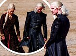 The actor, 38, transformed into Prince Daemon Targaryen as he sported a long blonde wig while shooting scenes on a windy Holywell Bay Beach in Cornwall, confirming the south-west coast will be a key filming location.