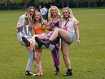 A group of revellers arrive for the music festival in Liverpool's Sefton Park today