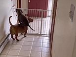 Barkour! Puppy hops on bigger dog’s back to jump over safety gate in hilarious break for freedom
