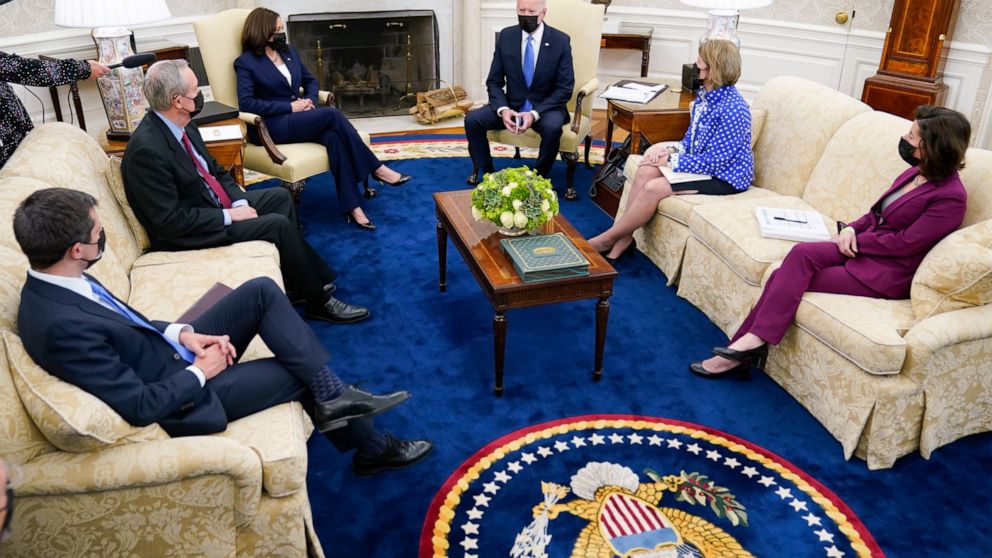 Those gathered included some of the top ranking Republicans — Sens. John Barrasso of Wyoming, Roy Blunt of Missouri, Mike Crapo of Idaho, Pat Toomey of Pennsylvania and Roger Wicker of Mississippi. Joining Biden were Vice President Kamala Harris, Transportation Secretary Pete Buttigieg and Commerce Secretary Gina Raimondo.