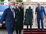 Camilla’s forest green coat dress with black bugle buttons was incredibly fitting for a trip to the Emerald Isle, and she once again teamed it with tall black boots (pictured with Charles at Belfast City Hall)