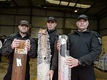 Today officers at Devon and Cornwall police force’s Exeter headquarters trialled techniques to remove some of the protestors makeshift ‘lock-on’ devices, commonly made from bike locks and bits of pipe, plastic and steel. Pictured: Adrian Waldron of the protester removal team of the Devon & Cornwall Police with a typical example of modern demonstrator equipment during the training day set-up by the police to showcase protester removal techniques they may be called upon to use at the G7 Summit in Cornwall in June