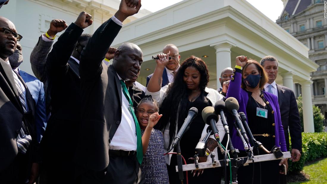 George Floyd’s daughter, Gianna, leads his family in chanting his name following a meeting at the White House with President Biden on the anniversary of Floyd’s death, and the family’s attorney Ben Crump answers a question about next steps for police reform legislation.
