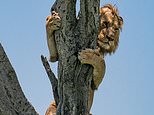 He said: ‘Suddenly the buffalo became aware of the lion’s presence. He saw a lonely tree on the great savannah and climbed to safety from the big buffalo. He stayed in the tree for nearly an hour, before the buffalo herd left the area.’