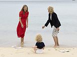 Carrie Johnson is pictured with First Lady of the United States Dr Jill Biden as Wilfred Johnson sits on the beach during the G7 leaders Summit in Carbis Bay Cornwall