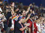 Because while the UK faces another four weeks of restrictions, everything is going on in the U.S. People are going to cinemas, nightclubs, bars, churches and baseball games — all filled to capacity, and mingling at close quarters with strangers. Pictured: Fans cheer as the US play against Jamaica in a soccer match in Houston, Texas on June 13