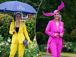 Not raining on her parade! One reveller didn’t let the wet weather dampen her spirits as she arrived in a bright pink three-piece suit complete with flamboyant fascinator and matching brolly