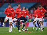 Harry Kane leads the England stars such as Jordan Pickford behind him out onto the soaking wet turf at Wembley for the match