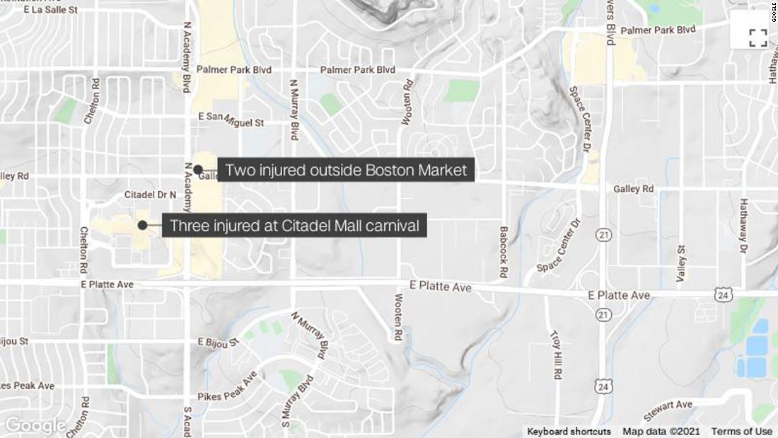 The first shooting involved “a disturbance between two known groups” at a mall carnival, where three juveniles were transported to a hospital, the Colorado Springs Police Department said in a series of tweets.