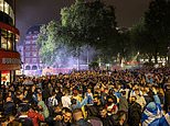 Pictures captured Leicester Square packed with Scotland fans jubilantly singing, chanting and letting off flares after the England v Scotland game ended in a 0-0 draw last night