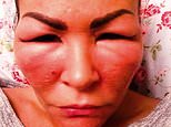 - Photos show her face swollen from reaction which closed up her eyes and throat