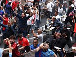 As jubilant fans celebrated – and thousands poured out onto the streets in Three Lions jerseys – bustling parties emerged in Leeds and Newcastle (above), with fans tearing through the cities cheering and spraying beers over each other