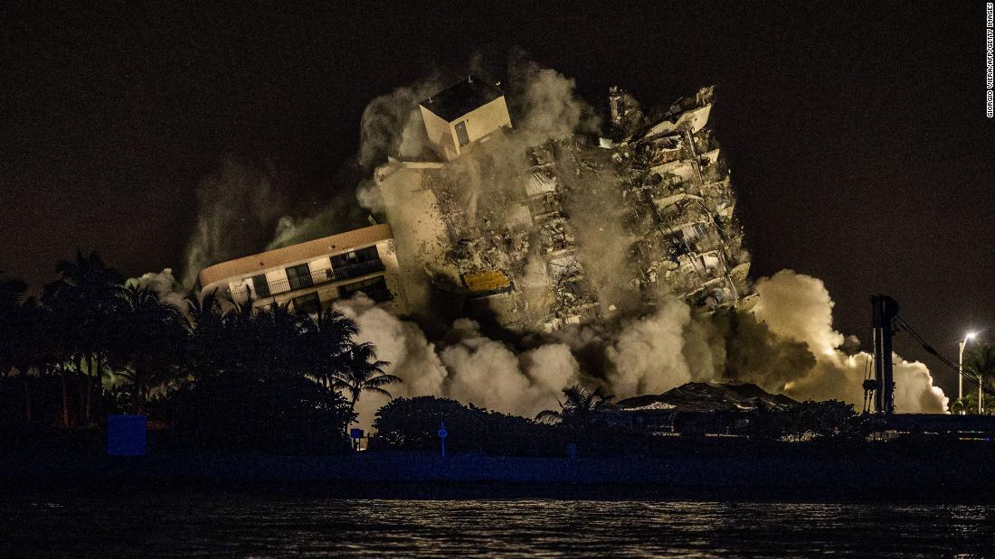 A controlled explosion brings down the unstable remains of Champlain Towers South late Sunday, July 4.