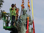 The statue of Confederate General Thomas ‘Stonewall’ Jackson is put into chains and removed with a crane after years of legal wrangling