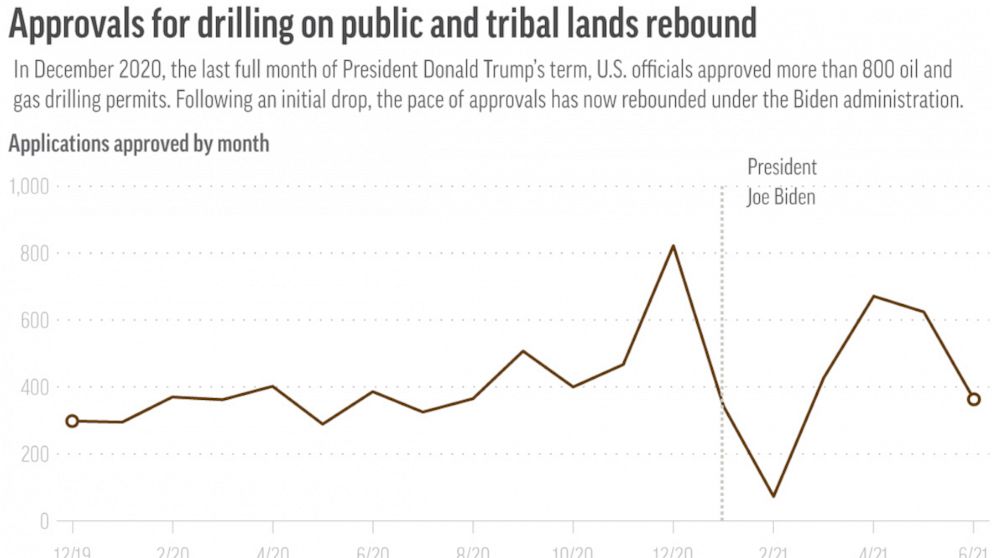 The Interior Department approved about 2,500 permits to drill on public and tribal lands in the first six months of the year, according to an Associated Press analysis of government data. That includes more than 2,100 drilling approvals since Biden took office January 20.