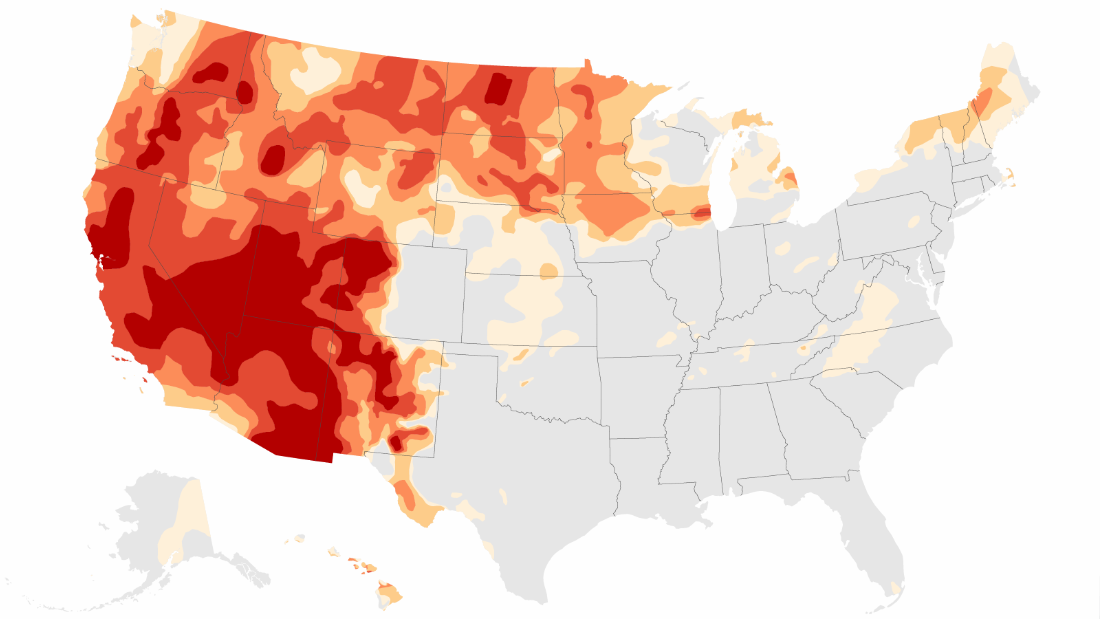 The West experienced extremely low rain and snowfall over the past year, compounded by drastically high temperatures. Less rain and increasing heat waves have led directly to drought conditions and water shortages.