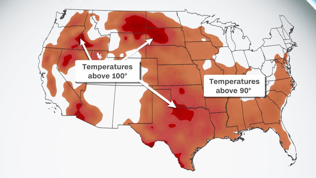 Widespread triple digits will hit the western and central US on Monday, with highs in the 100s spanning the Great Basin, northern Plains and southern Plains.