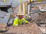 A United Utilities worker inspects a 4.5 metre (15ft) by six metre (20ft) sinkhole in Green Lane, Old Swan, Liverpool, caused by a suspected ruptured water main