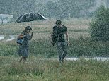 Parts of south east England saw up to 50mm of rain in just an hour on Sunday afternoon as the area was battered by torrential thunderstorms and downpours (Pictured: People walking in Wimbledon Common, south west London, shelter from heavy showers under an umbrella)