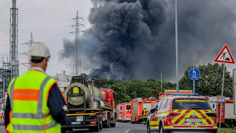 The explosion at the waste management facility of the Chempark site in Leverkusen, near Cologne, sent a large black cloud into the air. It took firefighters almost four hours to extinguish the fire that took hold after the explosion.