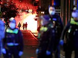 A large ball of fire is captured in the background as chaotic anti-lockdown protests erupted in Melbourne on Thursday night (pictured) with hundreds taking to the streets