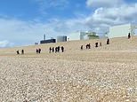 It came as around 30 migrants were rescued by the RNLI off Dungeness. They were seen sitting on the shingle as they disembarked the lifeboat one by one while their grey RHIB with outboard engine was towed to shore.