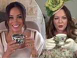 The American actress jokes: ‘This will probably be better for you,’ while both are also captured enjoying a sip of tea from elegant cup and saucers.