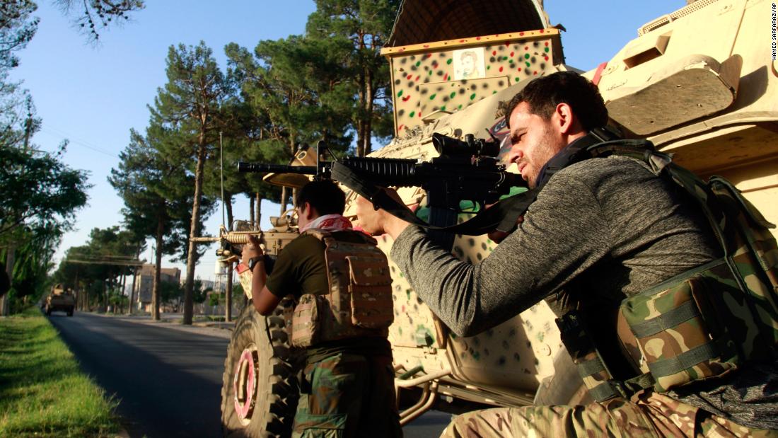 Afghan security personnel take a position during fighting between Taliban and Afghan security forces in Herat province, west of Kabul, Afghanistan, on August 3, 2021.