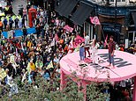‘It’s another kick in the teeth after Covid’: Furious business owners slam Extinction Rebellion for bringing capital to a standstill AGAIN as topless activist joins group as they erect giant pink table in road and chain themselves together under vans