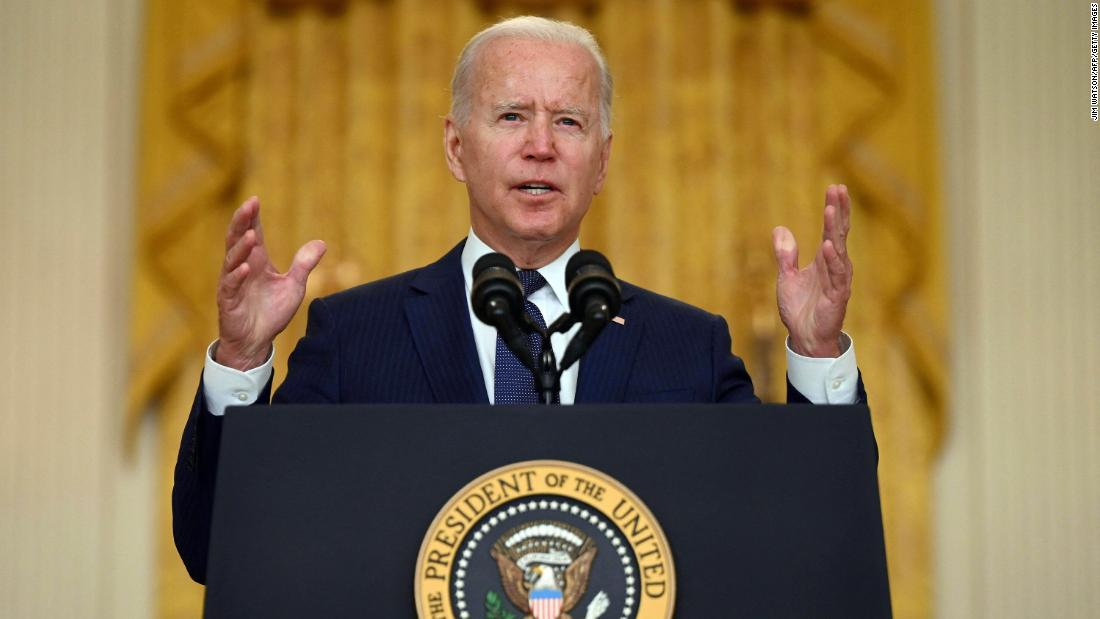 US President Joe Biden delivers remarks on the terror attack at Hamid Karzai International Airport, and the US service members and Afghan victims killed and wounded, in the East Room of the White House, Washington, DC on August 26, 2021.