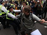 A police office tussles with a demonstrator on the A4 outside the Natural History Museum