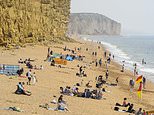 Beach-goers look at rockfall at the seaside resort of West Bay in Dorset as warm weather prepares to make a return